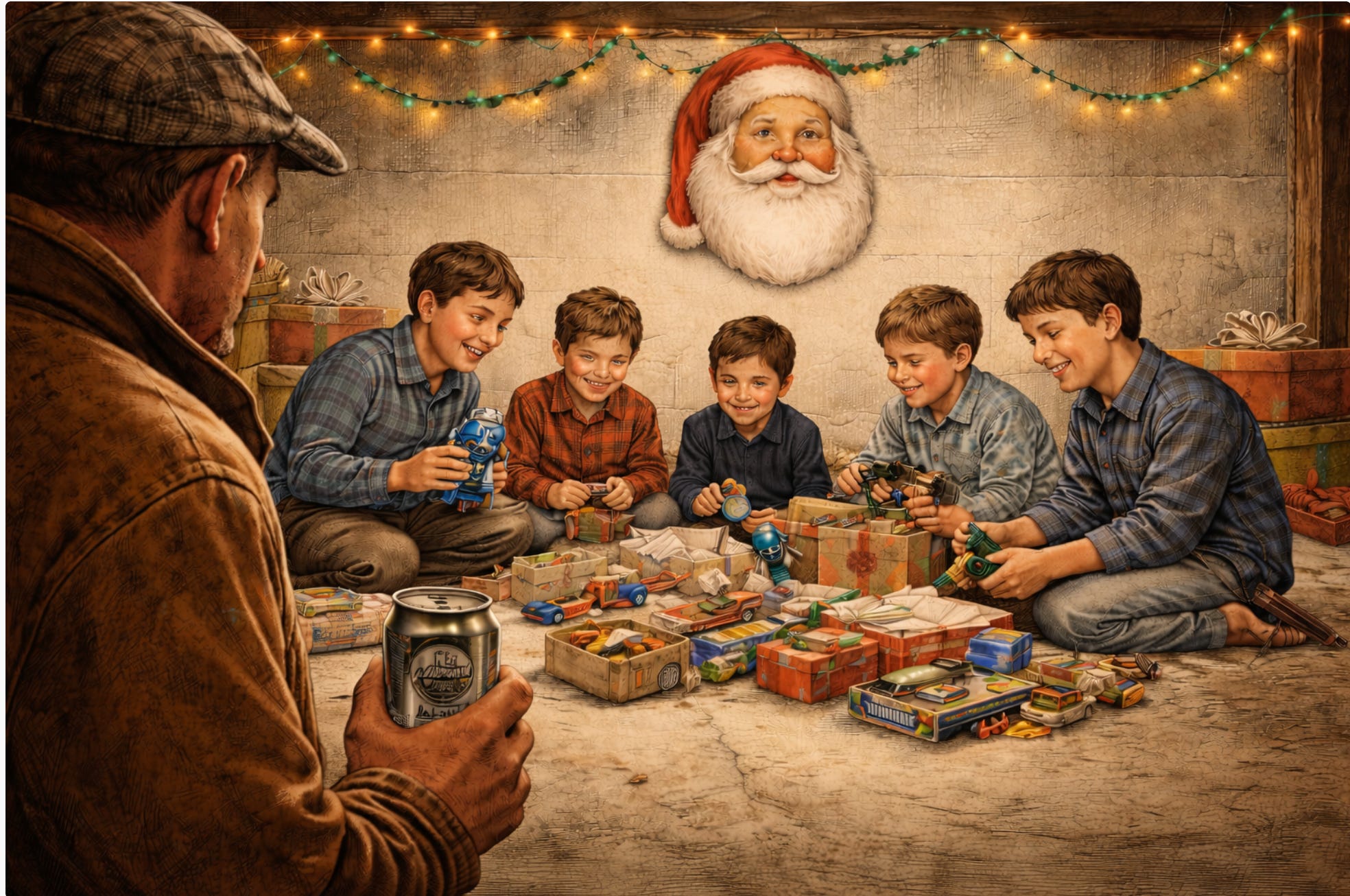 He followed the boys into the basement. The gifts were kept in a dirt-floored side room that used to be a coal bin. It smelled like dust. The boys knew by then there was no Santa Claus. There was just a pile of plastic department store bags, sealed with double knots.